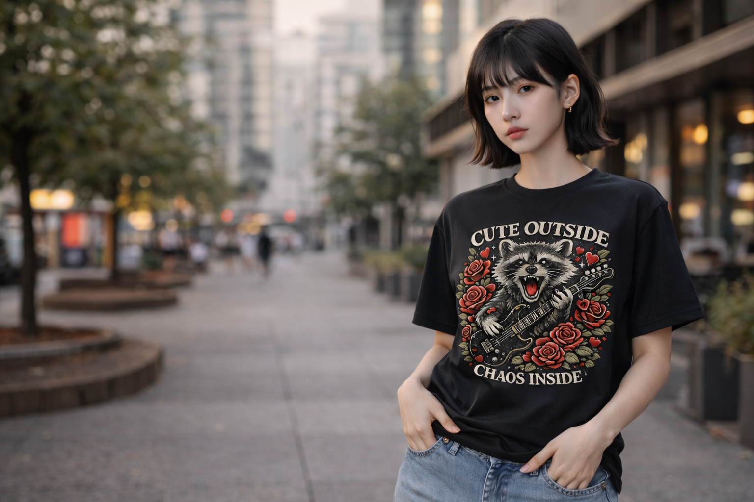 Feral Valentine Raccoon Guitar Shirt – Cute Outside / Chaos Inside – Heavyweight Garment-Dyed Tee